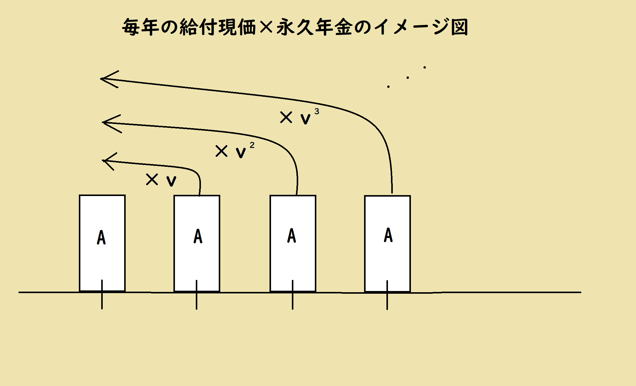 このAは毎年、人が加入することで、毎年発生するものなので毎年生じるAの現価の和を求めると