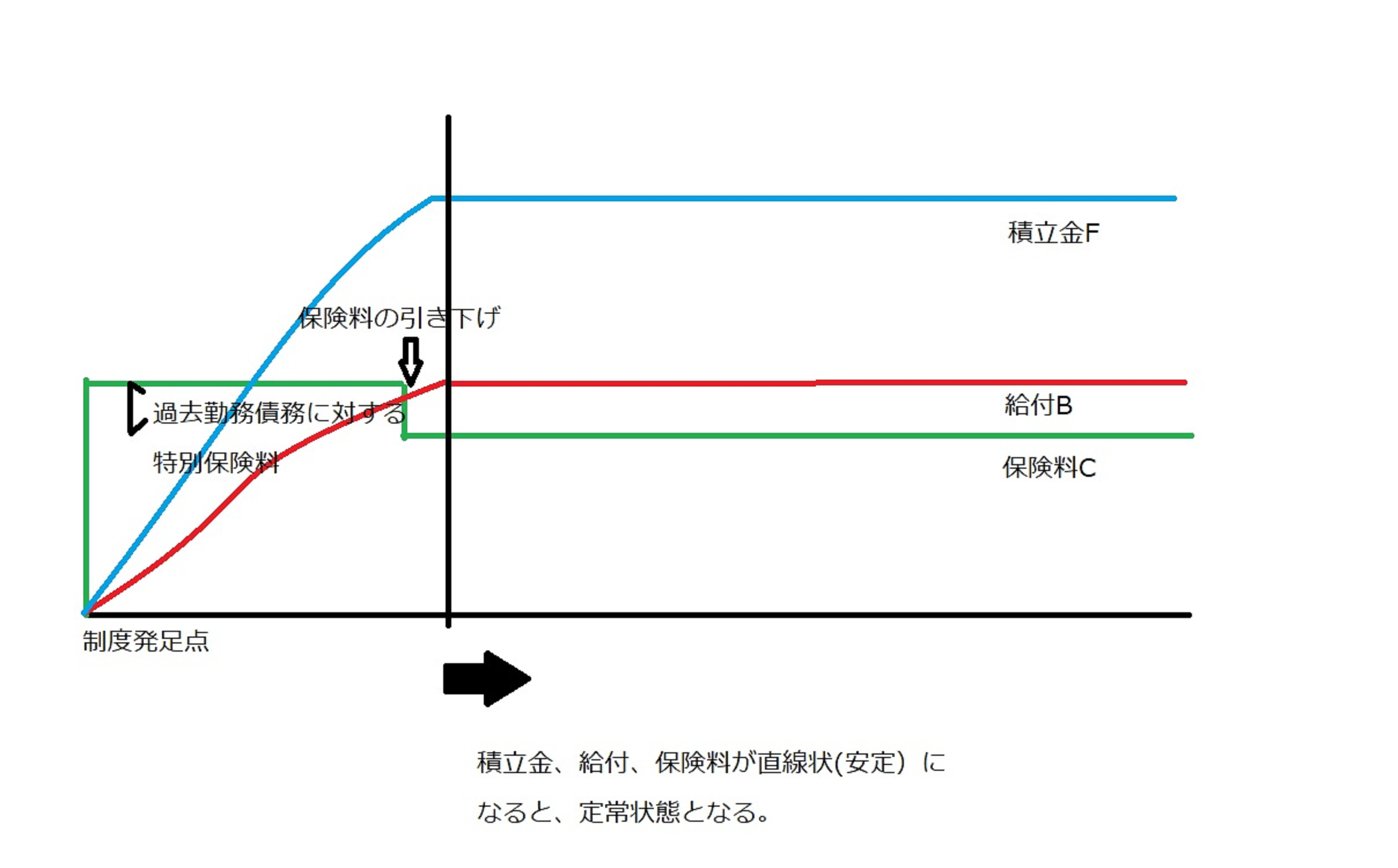 年金制度の導入初期の保険料に関しては、制度発足時に過去の勤務期間に対しての給付を通算する場合(過去勤務債務がある場合)は、積立金が不足するため、追加の保険料(特別保険料)を通常の保険料に加えて、徴収する必要があります。また、積立金、給付も一定ではありません。