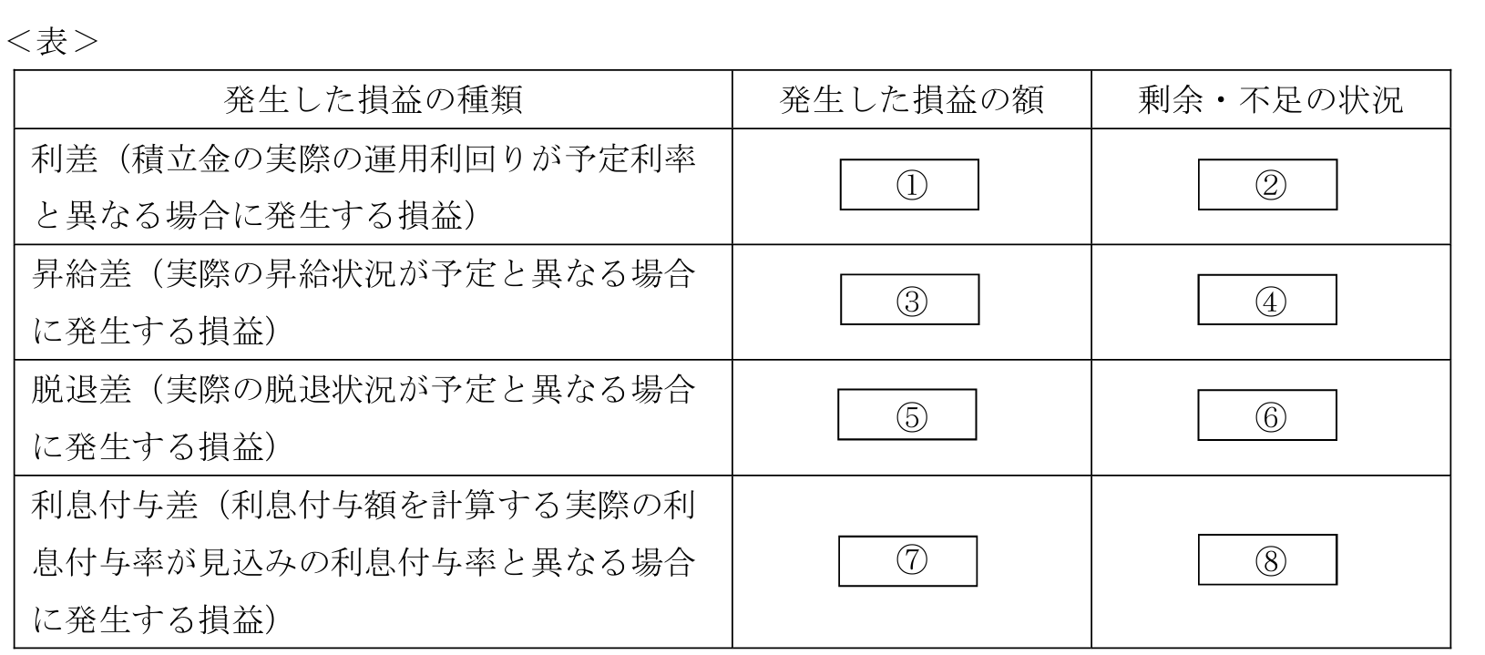 運用利回り、昇給、脱退および利息付与率以外は計算基礎率どおりに推移したとき、翌期末において発生した損益の種類ごとの当該損益の額および剰余・不足の状況は次の表のとおりであった。