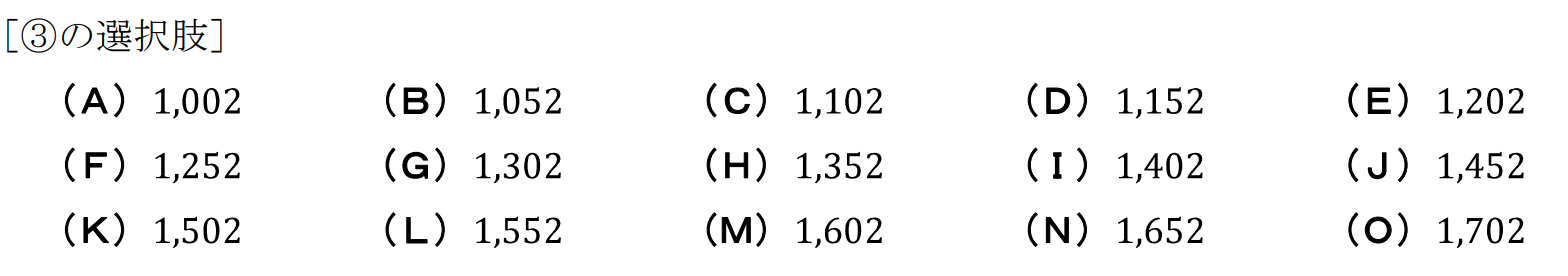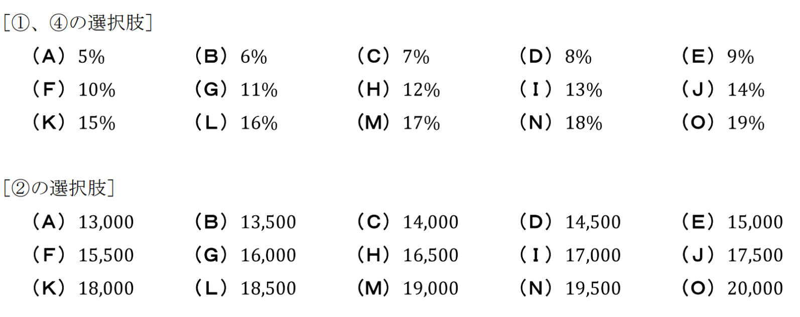 (1)の③の解答の特別保険料を使用したときに、翌期末の積立金\(\fbox{a}\fbox{b}\fbox{c}\fbox{d}\fbox{e}\)は 、特別保険料収入現価は\(\fbox{f}\fbox{g}\fbox{h}\fbox{i}\fbox{j}\)、責任準備金は\(\fbox{k}\fbox{l}\fbox{m}\fbox{n}\fbox{o}\)となった。表中①、③、⑤、⑦に最も近いもの、表中②、④、⑥、⑧に当てはまる最も適切なものをそれぞれの選択肢の中から1つ選び、アルファベットの空欄に入る数値を求めなさい。なお、それぞれの金額において小数点以下第1位を四捨五入して求めることとする。
