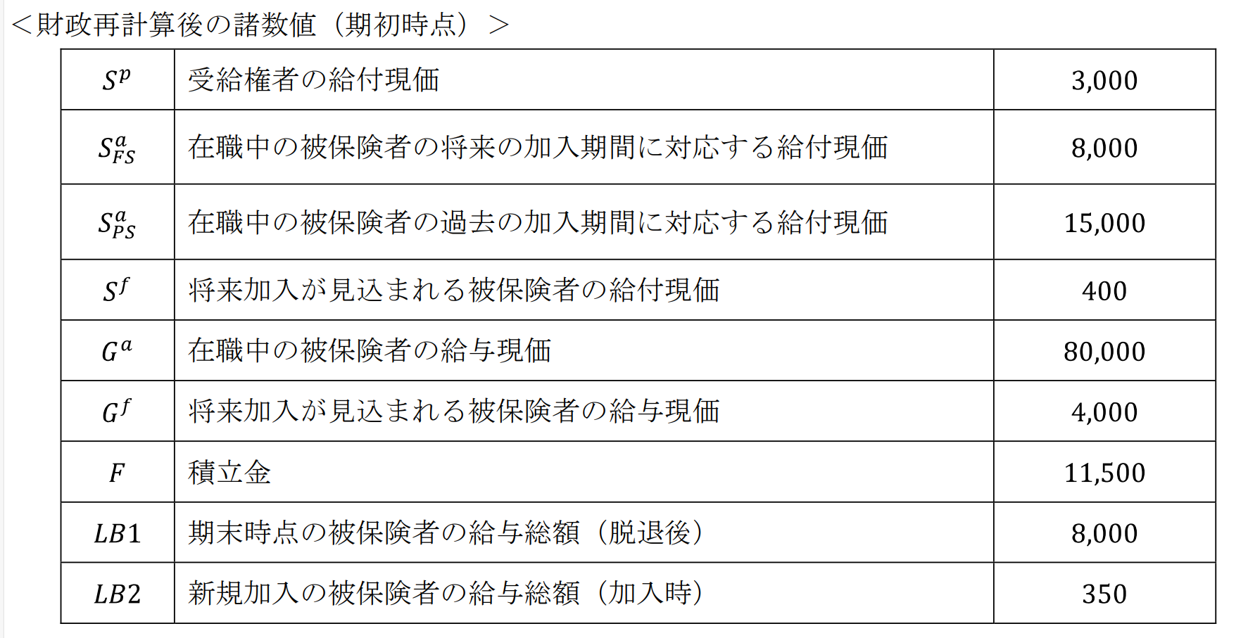 本問においては、加入年齢方式の標準保険料が\(\frac{S^f}{G^a}=0.1\)となることに加えて、在職中の被保険者が将来にかけて収支相等する率\(\frac{S^a_{FS}}{G^a}=\frac{8,000}{80,000}=0.1\)とどちらを計算しても、制度上10%に等しくなければならないことにも注意しておこう。