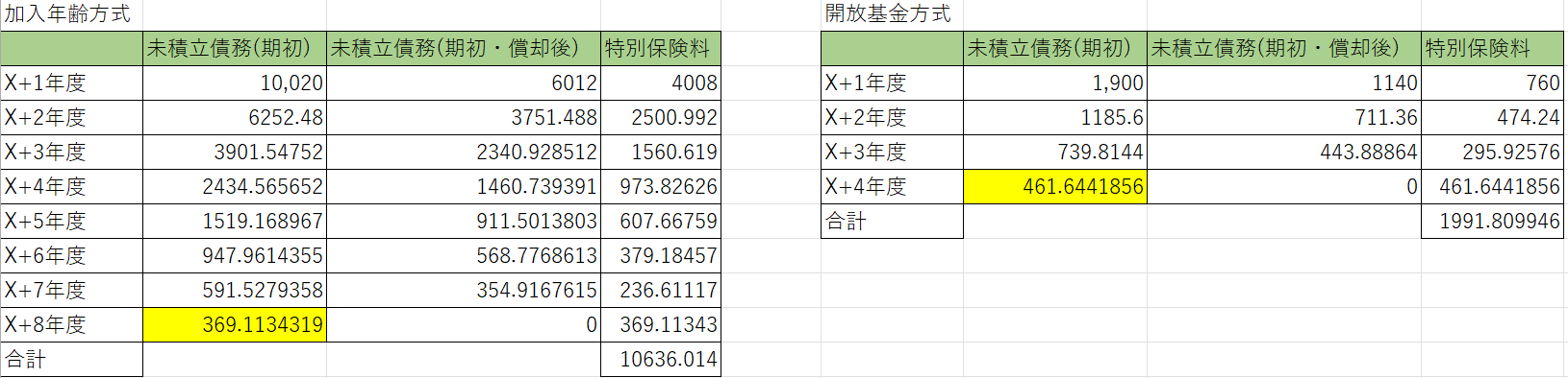加入年齢方式のほうが、償却するのに8年を要し、開放基金方式は4年を要するため、\(\fbox{➀}:(B)\)、\(\fbox{②}:(D)\)となる。また、特別保険料の合計の差は8644.204054となるため、\(\fbox{③}:(J)\)が最も適切であるとわかる。